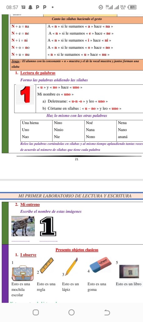 Nuestro manual se enfoca en la formación de palabras por sílabas, ayudando a tu hijo/a a leer, asociar dibujos con palabras y escribir corretamente bajo la ortografía fonética.