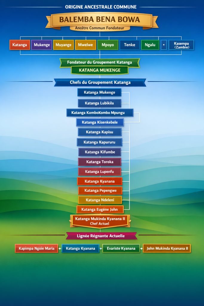 Tout commence par une racine commune. Le Sultanat puise son origine dans l’ancĂȘtre fondateur BALEMBA BENA BOWA, souche des plus grandes chefferies d’Afrique Centrale. De lui sont issus les piliers de notre rĂ©gion : Katanga Mukenge, Muyange, Mpoyo, Tenke, Ngalu, Munene, Kasempa (Zambie), Kazembe wa Lunda (Zambie) et le prestigieux Mwat Yav, lignĂ©e dont le Groupement Katanga sâhonore dâĂȘtre le descendant direct.